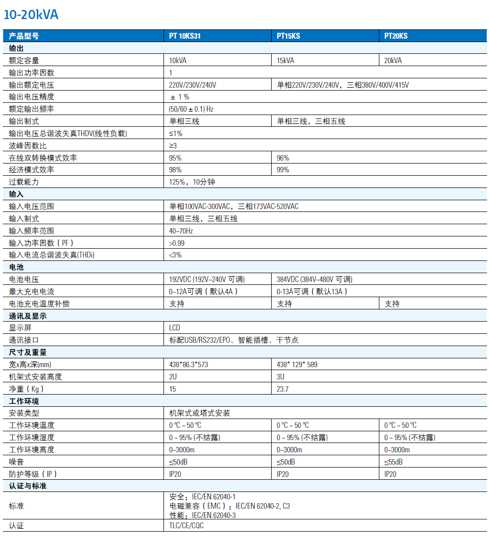 更高的效率,更小的體積。全系列輸出功率因數為1,10kVA雙轉換模式效率高達95%,機架式安裝時高度2U,深度小于600mm。